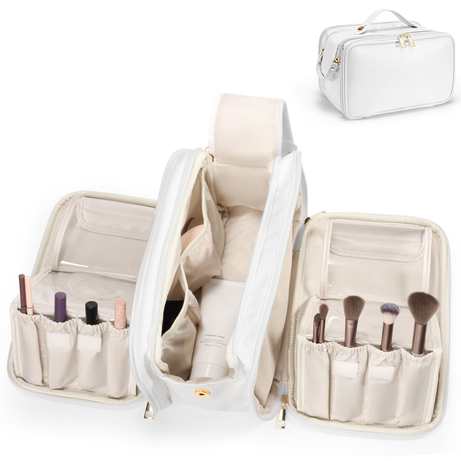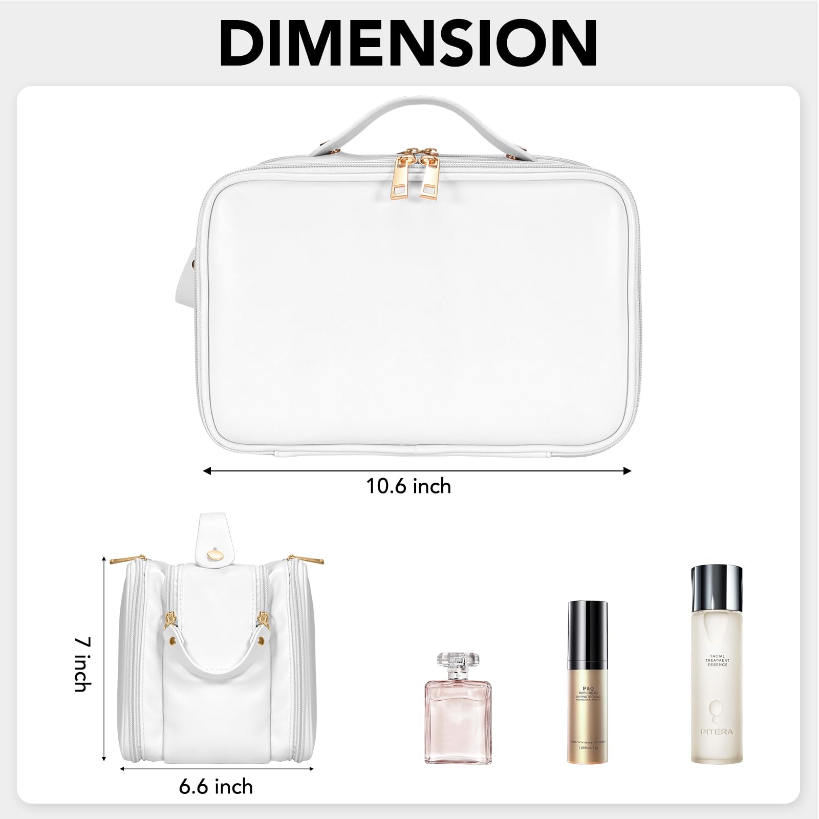 Travel Makeup Bag Women's Large Capacity Cosmetic Portable Organizer Waterproof Large Opening Storage Toiletry Bags Vertical Free-Standing Brush Holder for Easy Access(White)