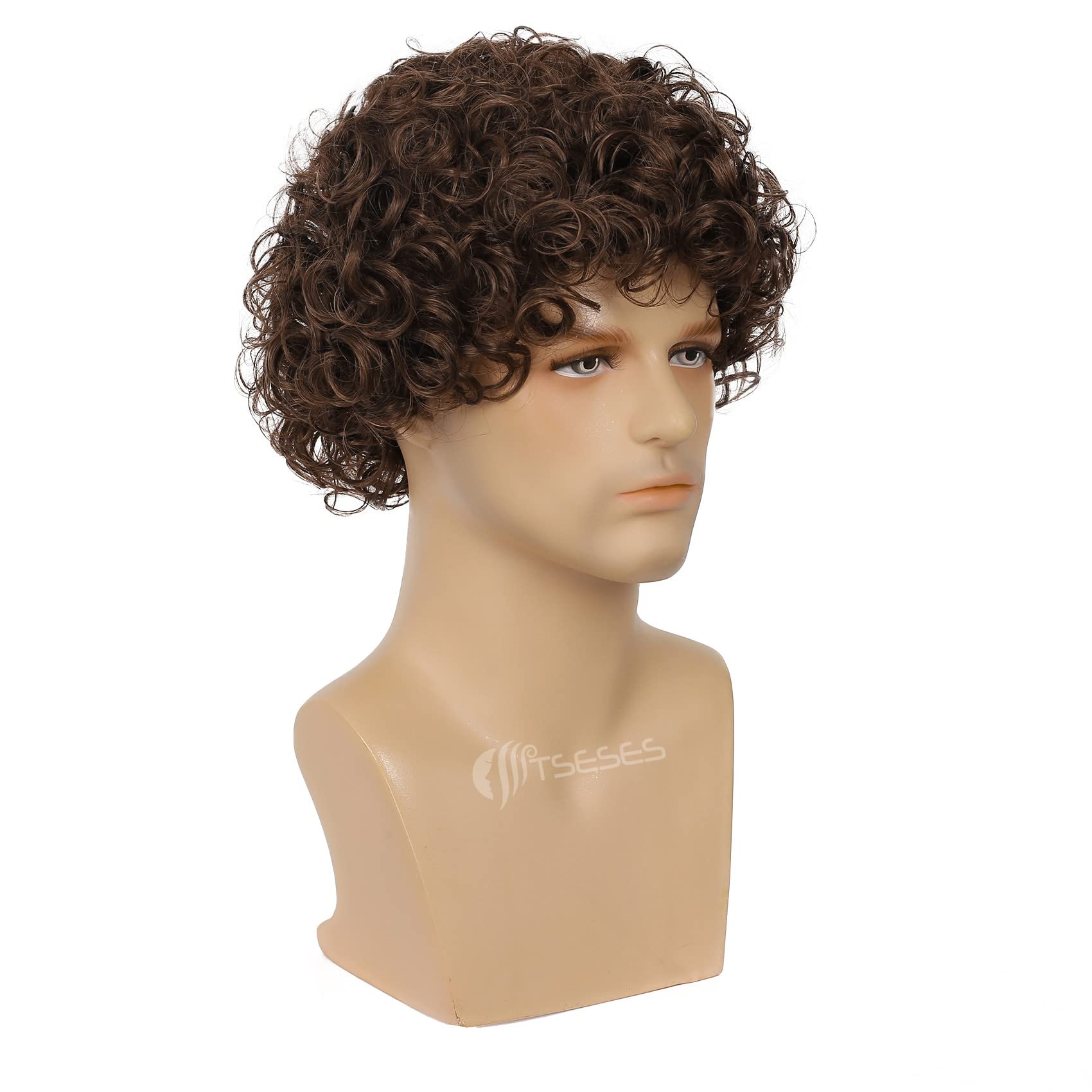 Tseses Brown Curly Short Afro Wig for Male Guy California Mens Cosplay Costume Daily Hair Synthetic Heat Resistant Mens Full Wigs