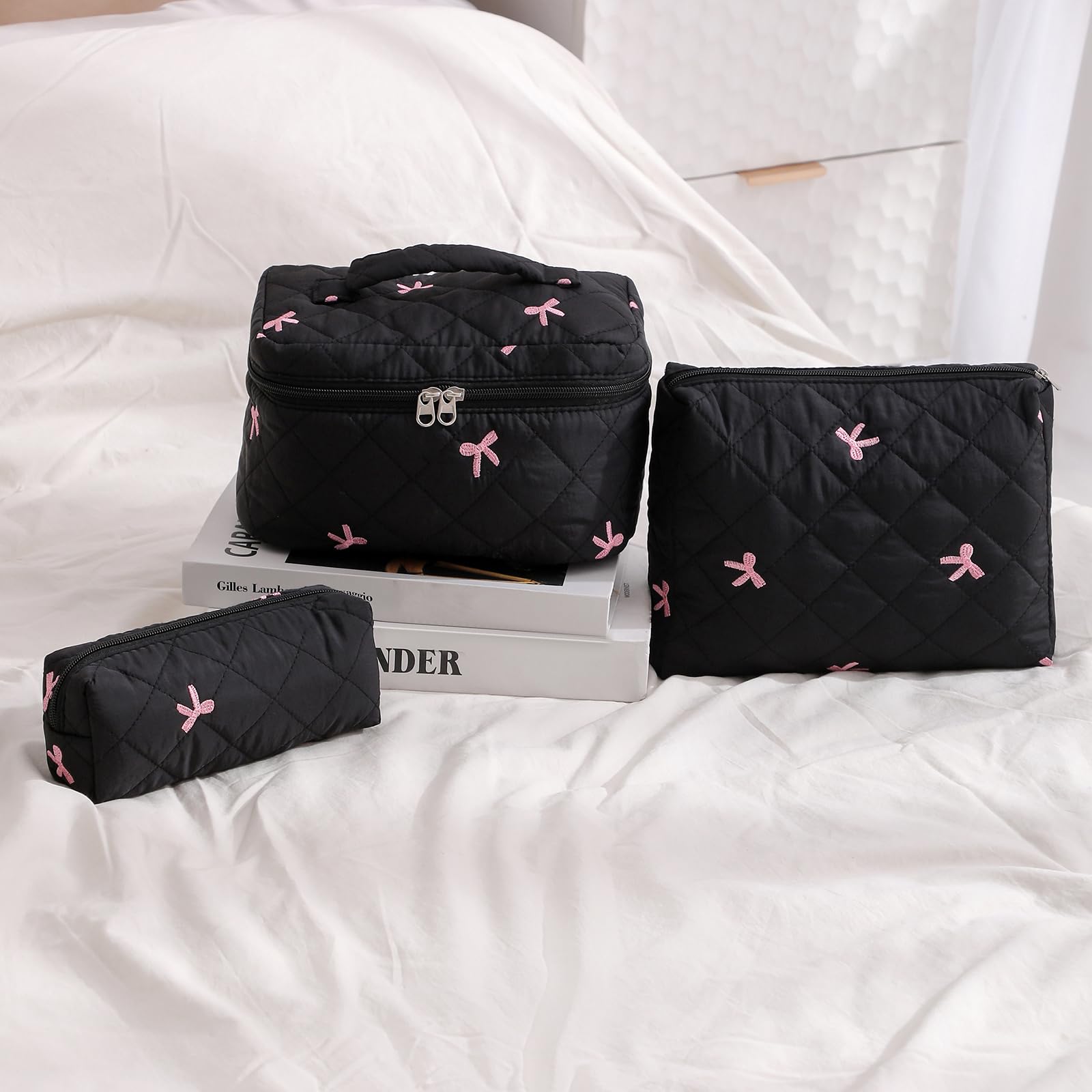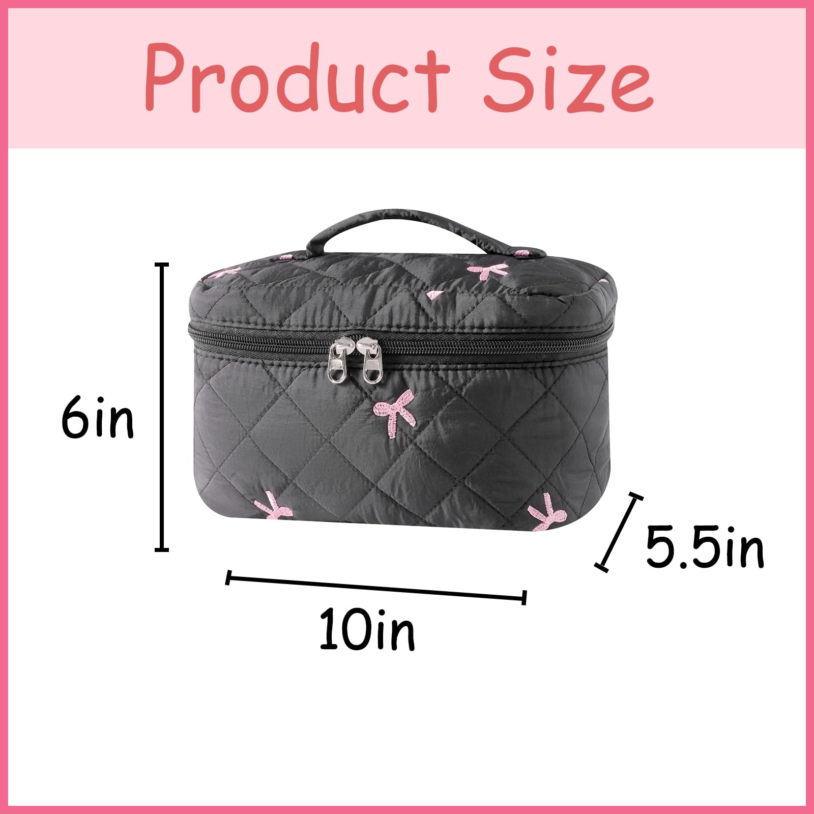 uekeboag Large Travel Quilted Makeup Bag for Women, Floral Cotton Cosmetic Bag, Coquette Aesthetic Floral Toiletry Organizer Bag(13Black Bow