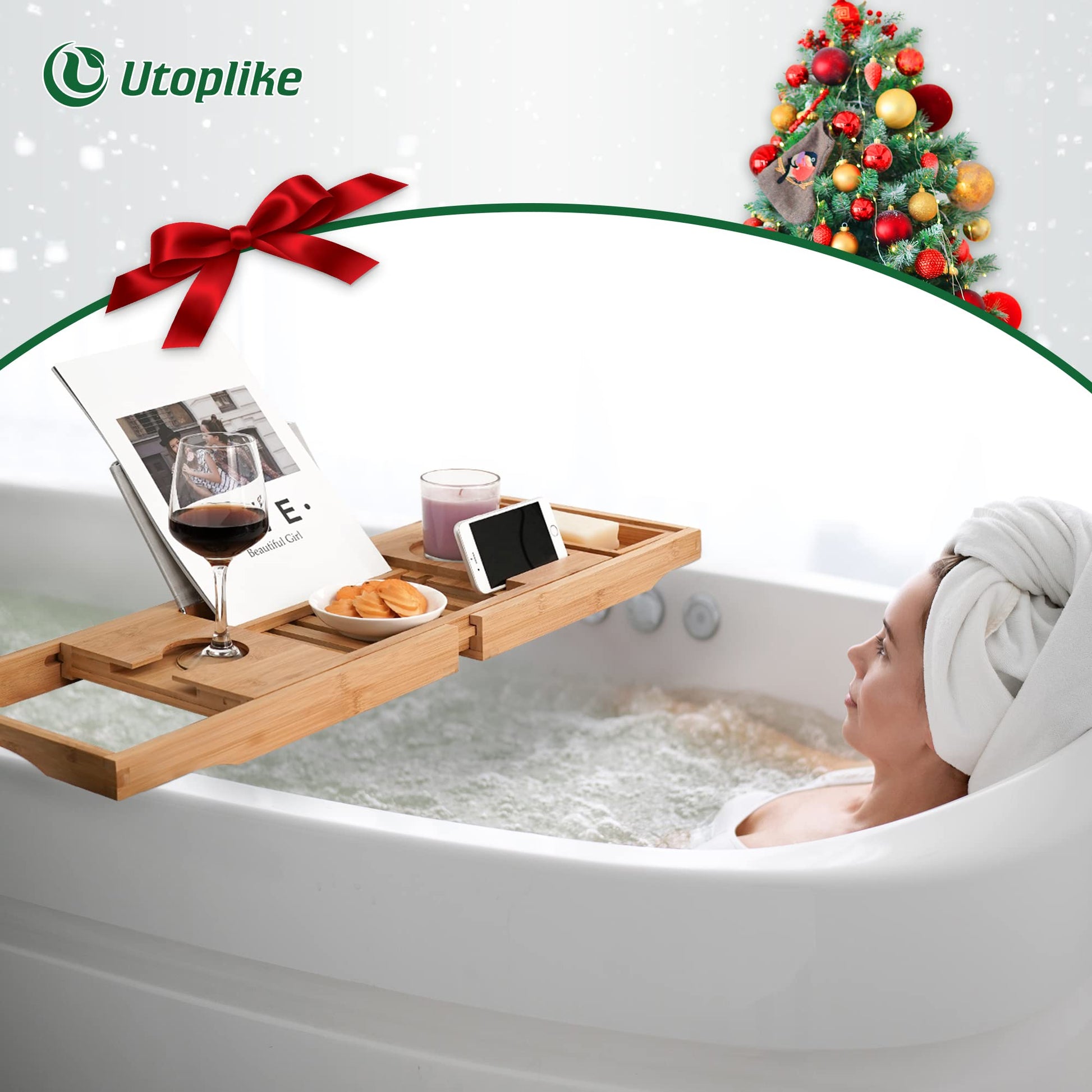Utoplike Bamboo Bathtub Caddy Tray Bath Tray for Tub, Adjustable Bathroom Bathtub Organizer with Book Tablet Wine Glass Cup Towel Holder