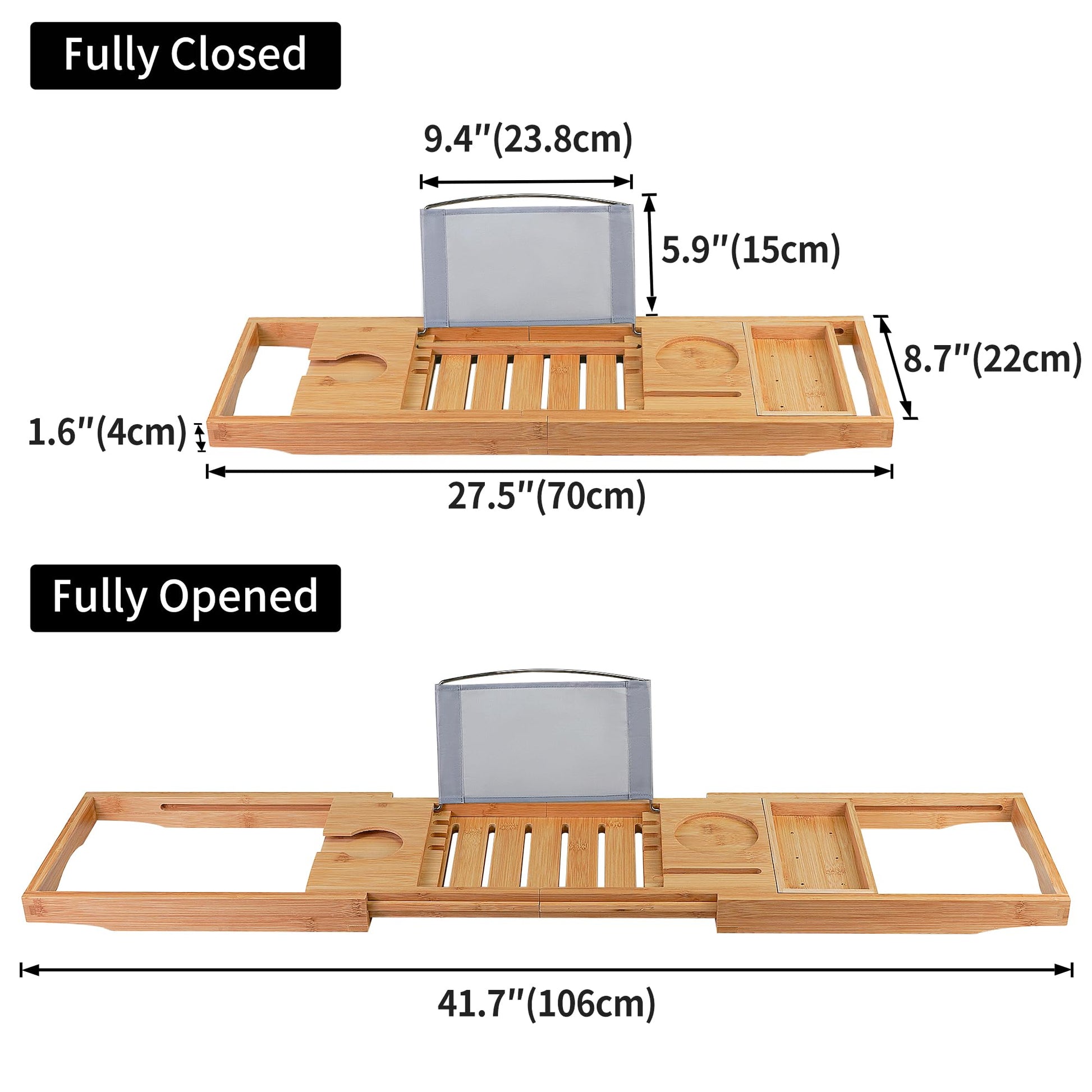 - Adjustable Tray: Slide apart from the middle to fit the width of your bathtub. Expandable arm from 27.5'' to 41.7'' to fits most standard bathtubs