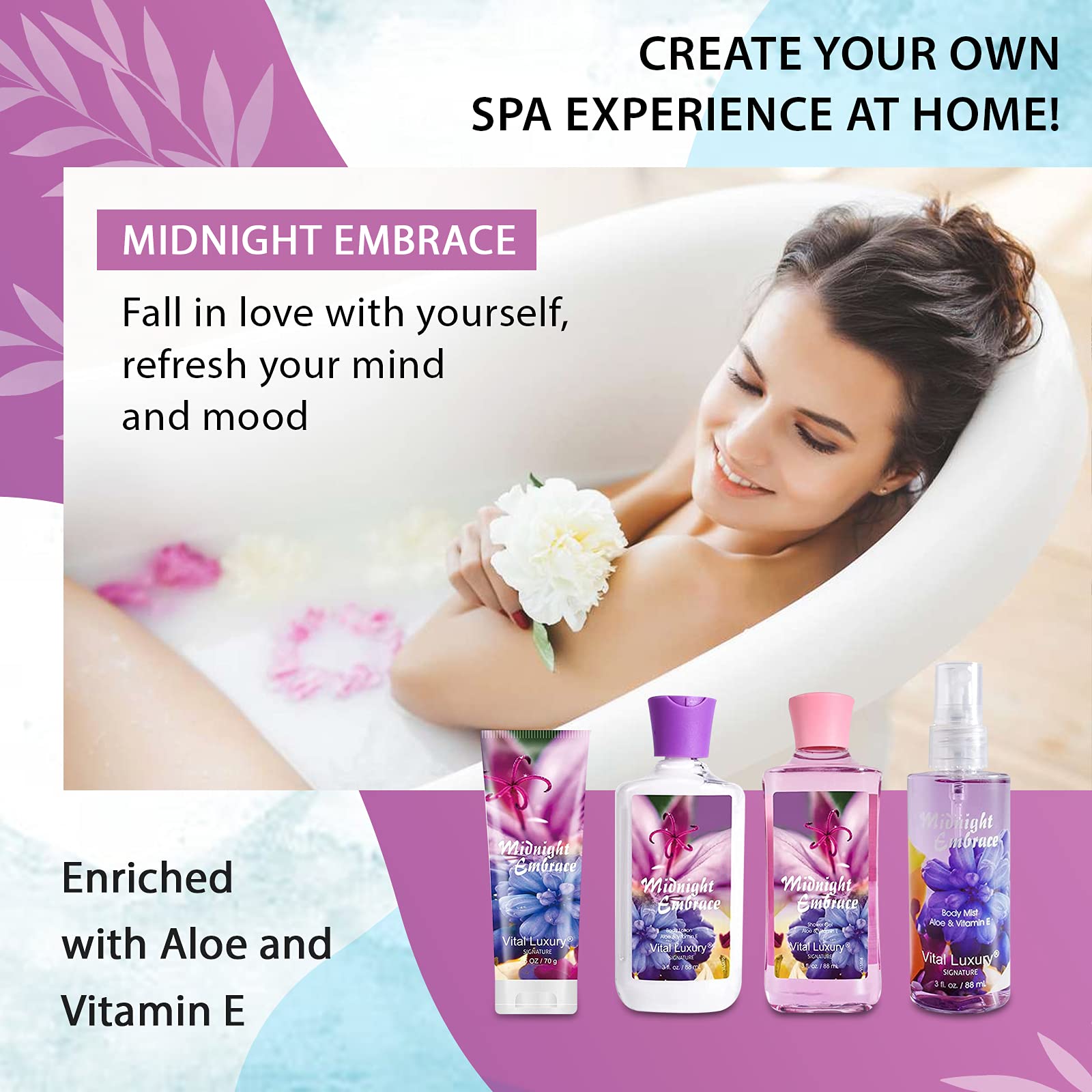 Vital Luxury Midnight Embrace Bath & Body Kit, 3 Fl Oz, Ideal Skincare Gift Home Spa Set, Includes Body Lotion, Shower Gel, Body Cream, and Fragrance Mist, Birthday Mother's Day Gifts