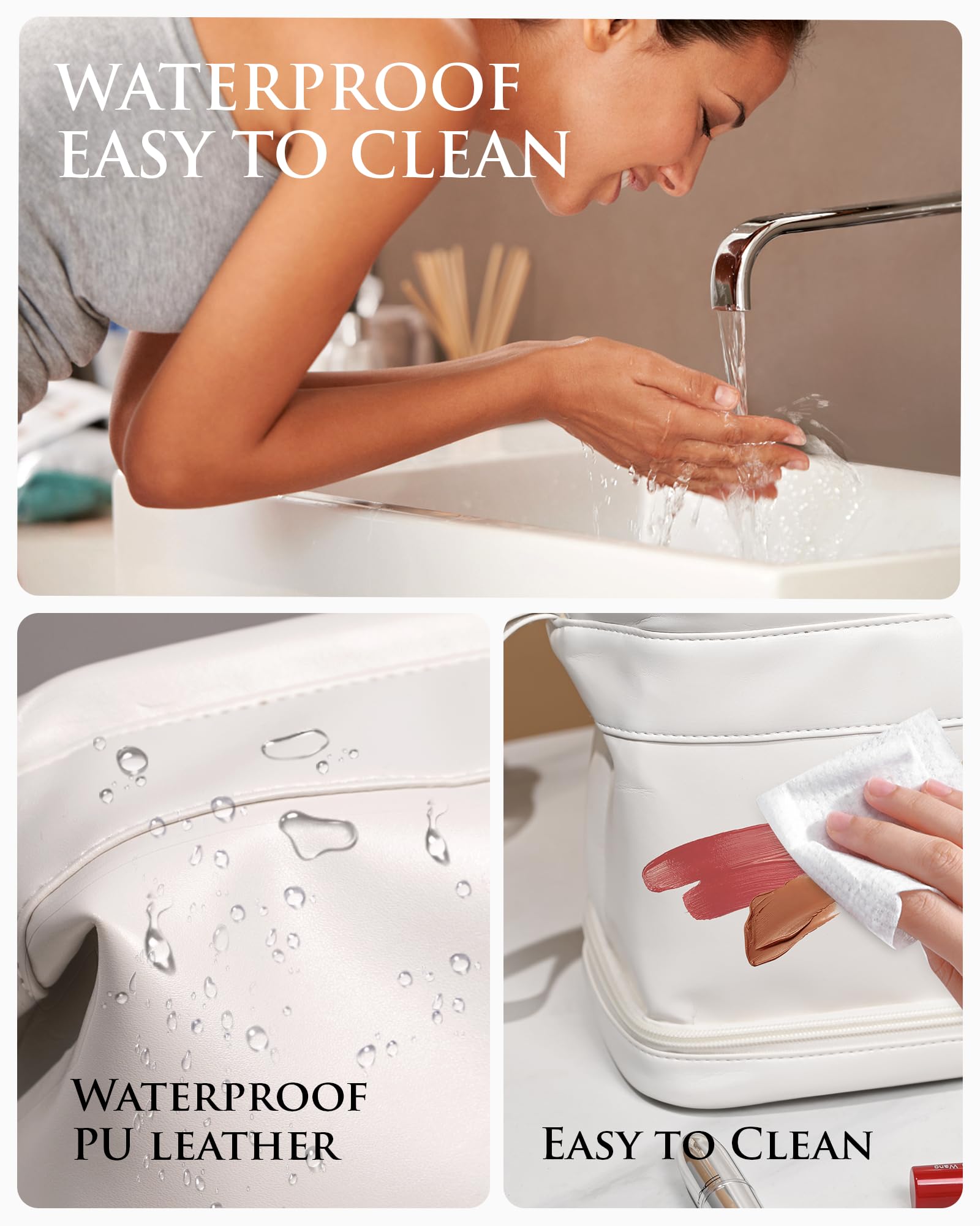 - 【High-Quality Materials】Our travel toiletry bag is made of soft, lightweight, and high grade leather fabrics that protect your makeup from scratches and splashes. It's also waterproof, so you don't have to worry about water splashing on it when washing your hands.