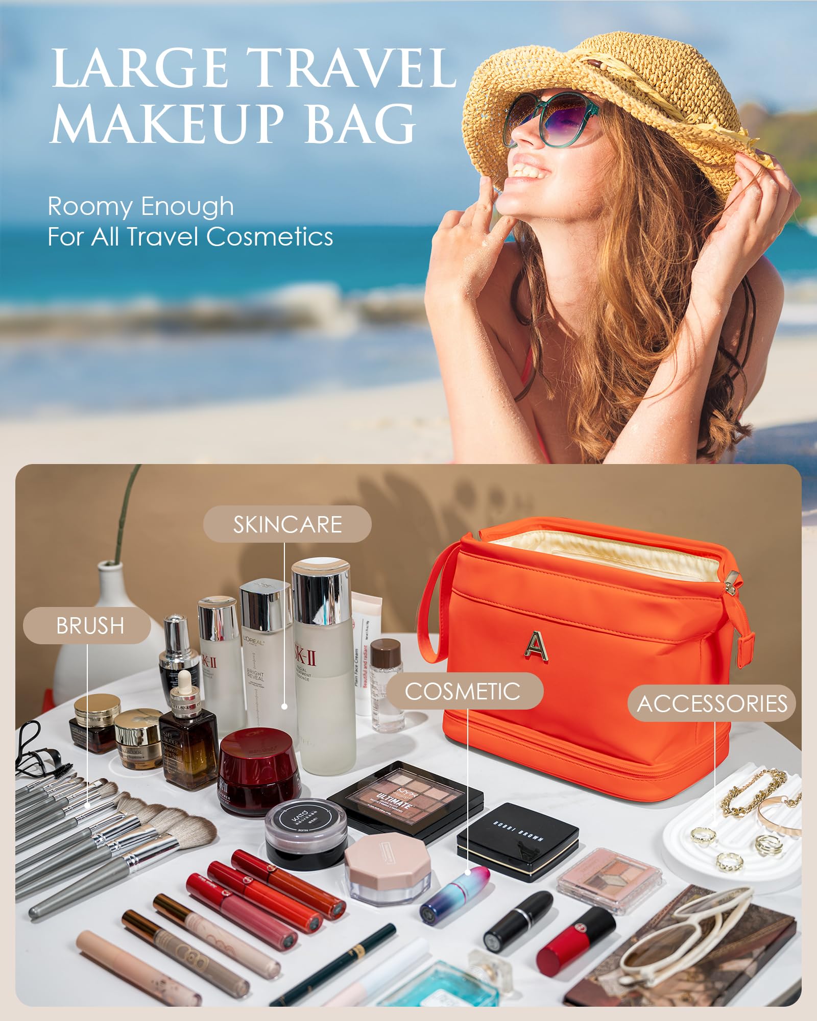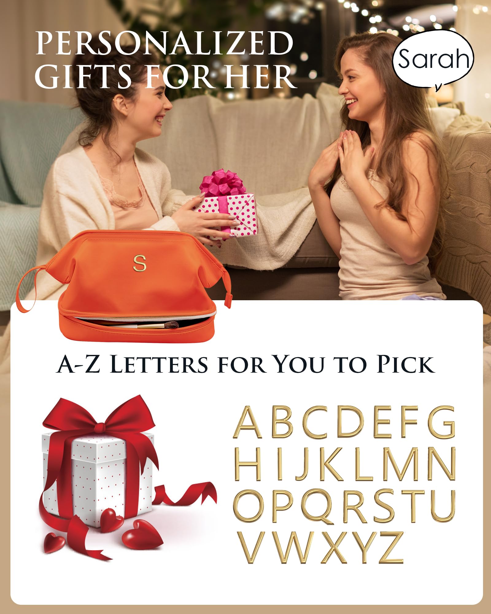 Vogewood Gifts for Women, Initial Large Makeup Bag, Travel Essentials, Personalized Double Layer Cosmetic Bag with Makeup Brush Organizer, PU Leather Travel Toiletry Bag, Gifts for Friends Female Mom