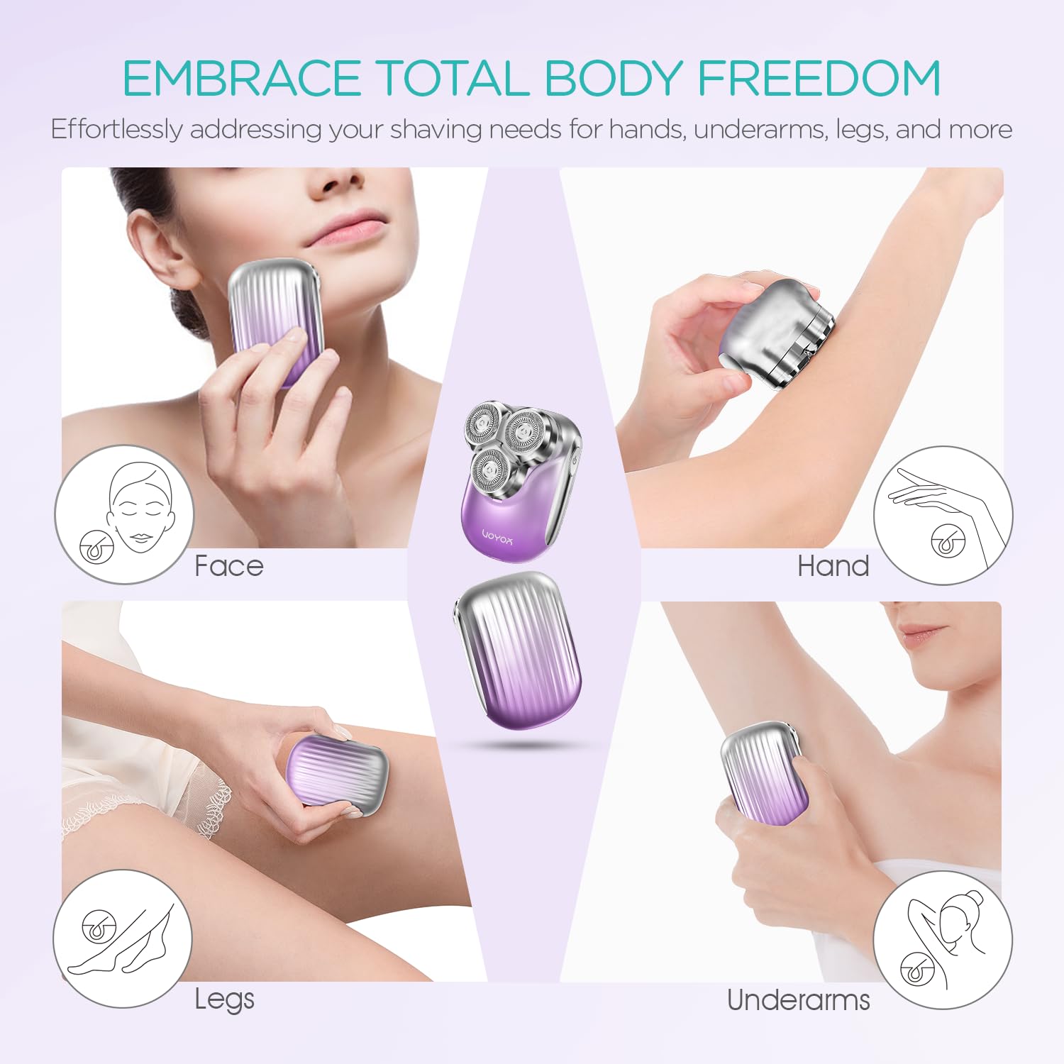 - Painless Hair Shaver: Women's electric razor adopts a double-track protective blade design. The precise spacing and rounded edge design of the blades ensure a smooth and gentle shaving process, allowing you to enjoy a painless womens shaver experience, achieving smooth skin on your face, arms, legs, body in just a few minutes.