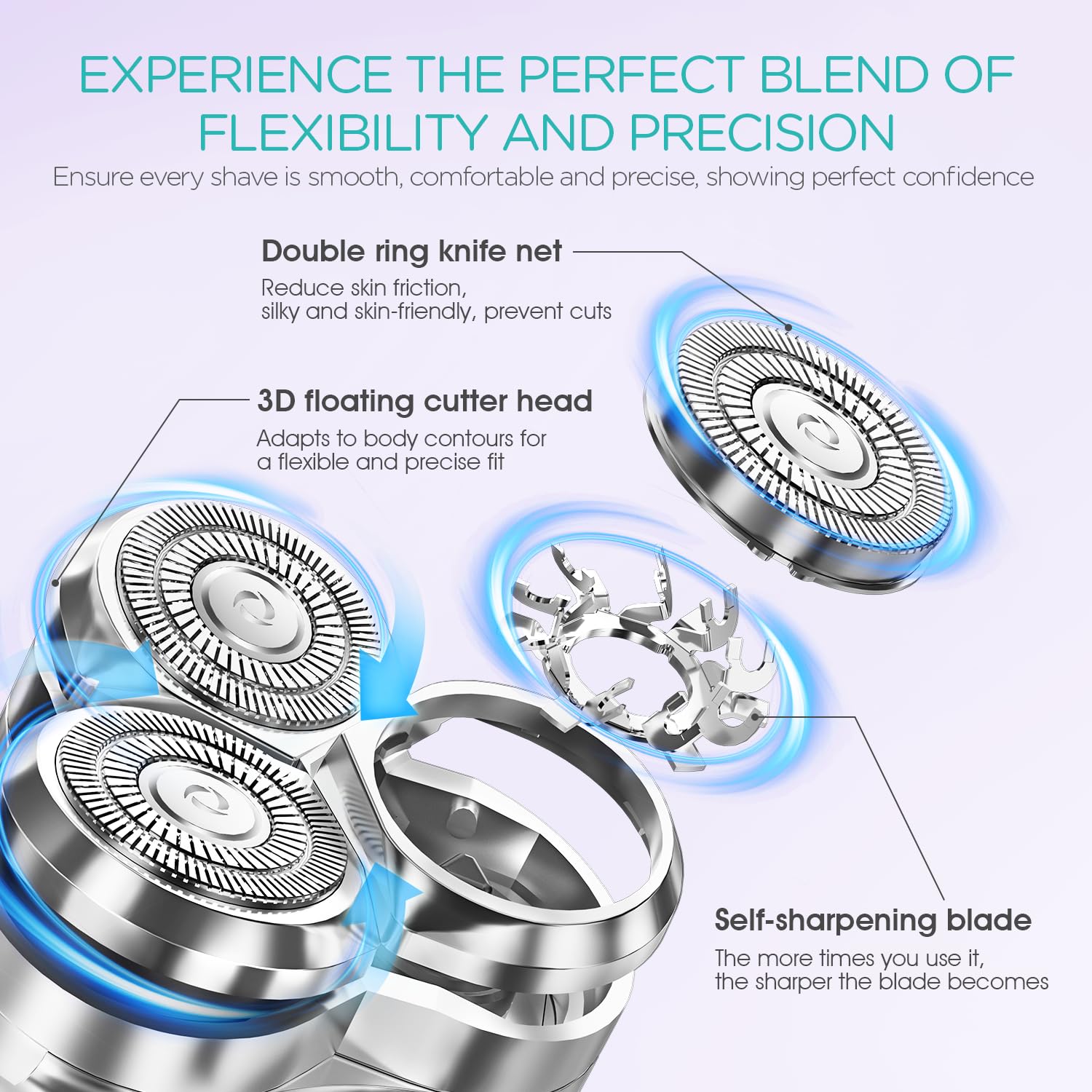 - Efficient And Long Lasting: 3D floating womens razors comfortably faces different contours and fits your body curves! Fast cutting with powerful motor, It shaves hair efficiently and closely. Internal self-sharpening blade design, blade and mesh grinding each other, the longer you use it, the sharper it gets, no need to worry about changing the blade frequently!