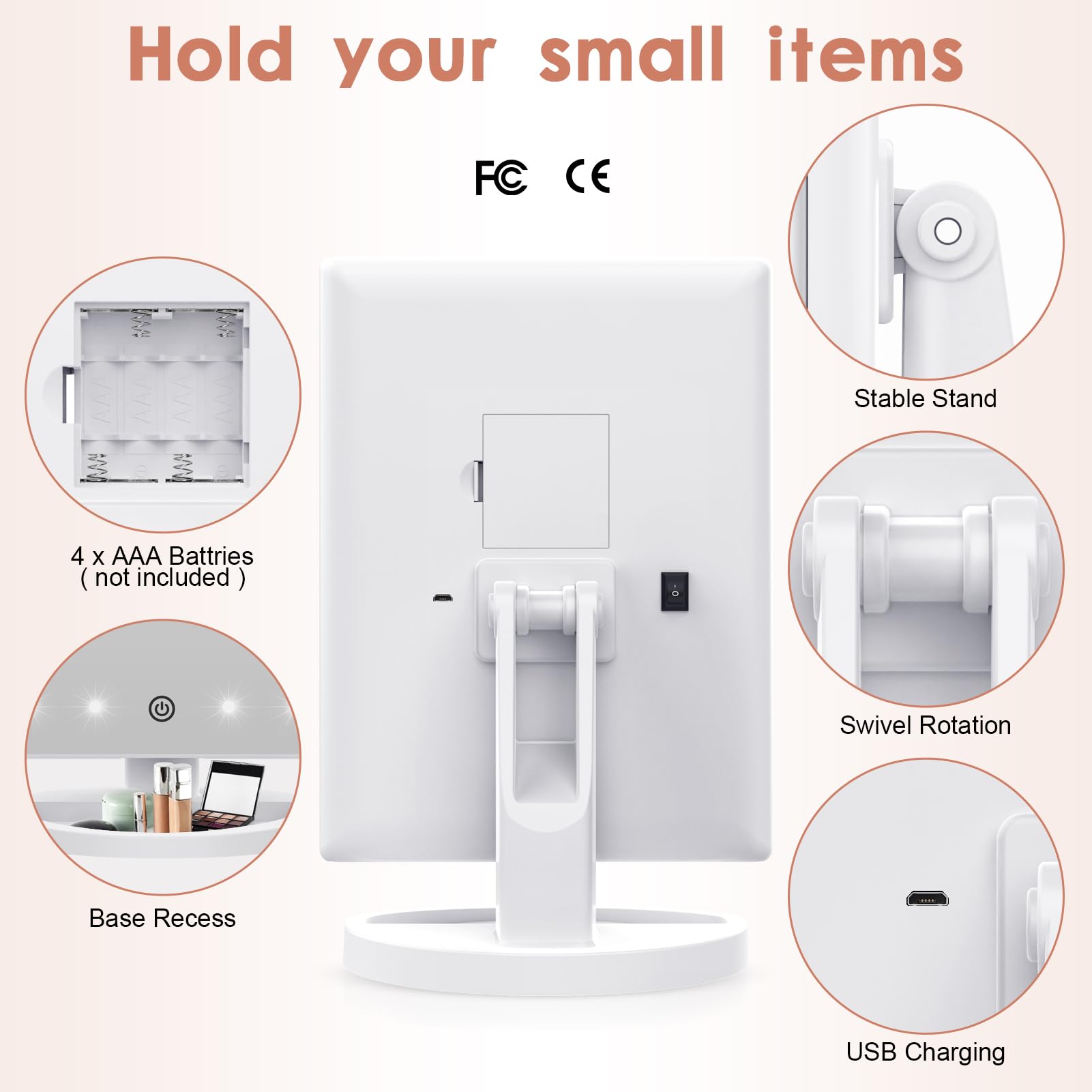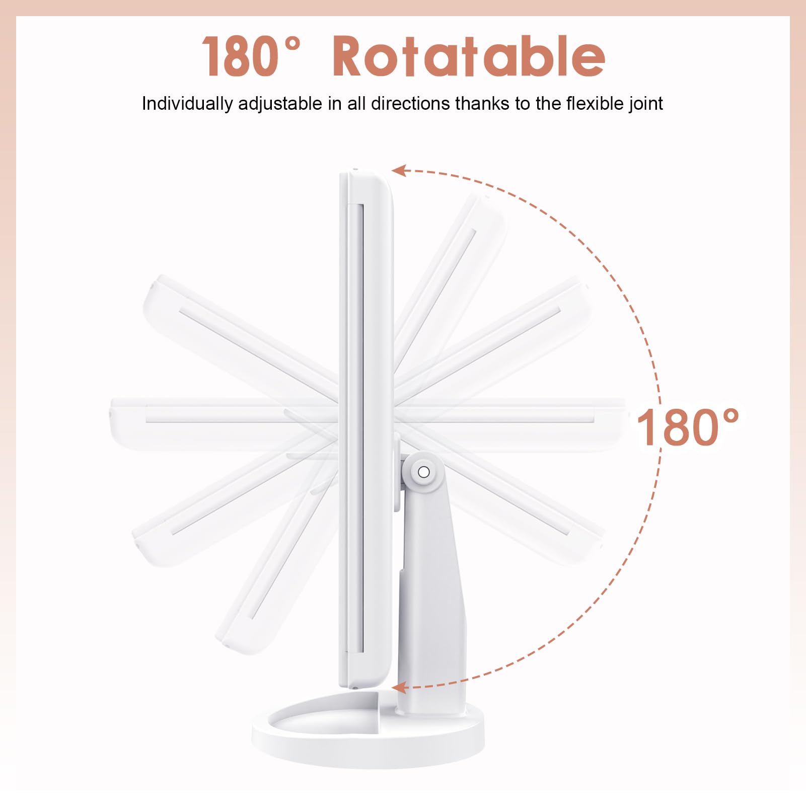 - [PORTABIE DESIGN&TOUCH CONTROL] The vanity mirror can be 180° up and down and then fixed to ensure a comfortable viewing angle, The bottom tray provides room for your makeup necessary, Long press the switch to adjust the lightness of the cosmetic mirror. Choose the suitable lightness then let go of your finger.