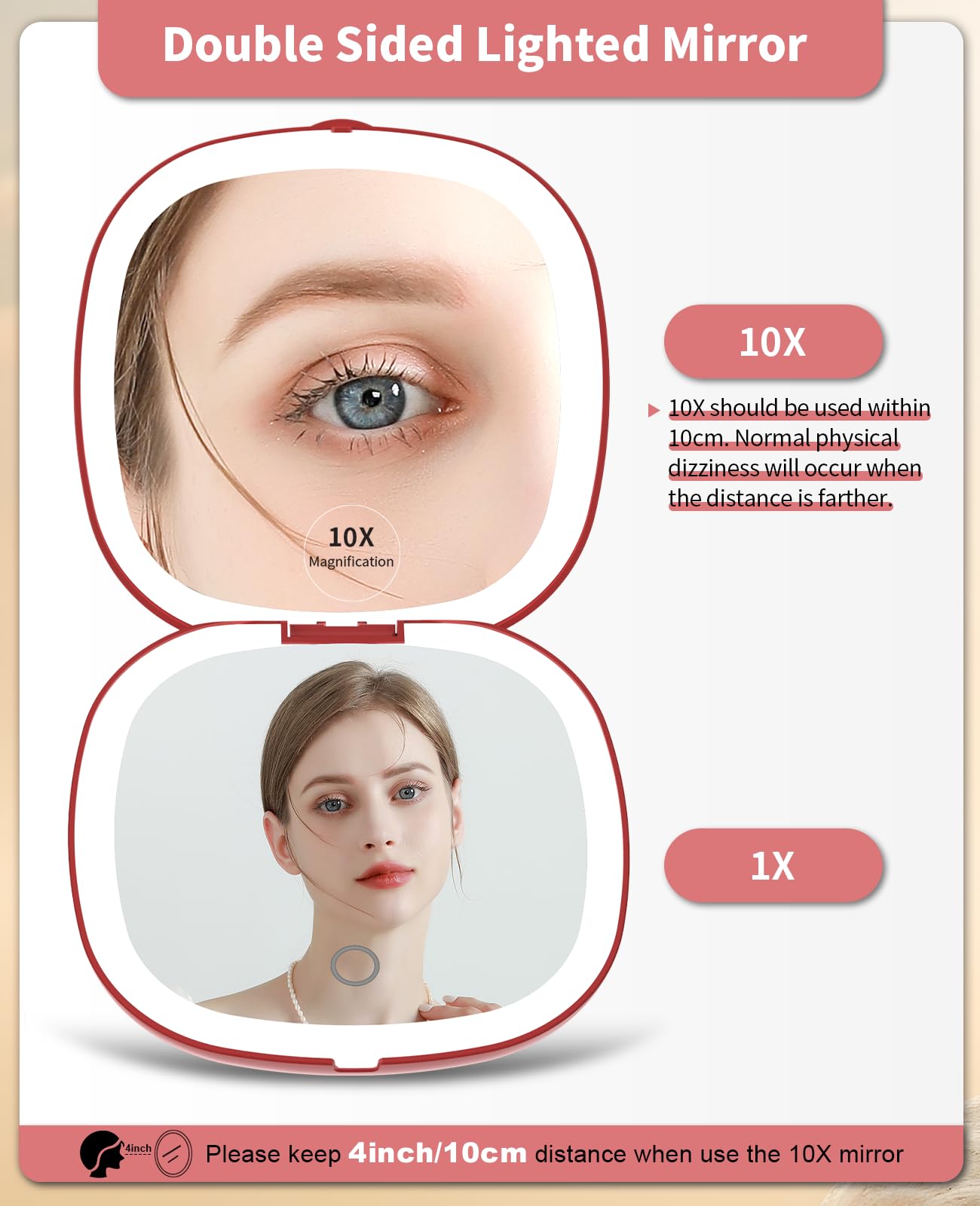 wobsion Travel Mirror with Light, Rechargeable 1x/10x Compact Magnifying Mirror, Dimmable Pocket Mirror,Handheld 2-Side Mirror with Light,4inch Travel Size,Portable for Handbag,Purse,Gift,Red