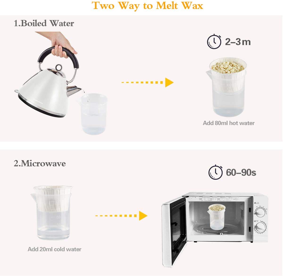 - ☆ THE APPLICATION IS QUICK AND EASY☆ Heat the desired amount of wax in the cup in the microwave until it thickens(15 to 25g beads).NO MICROWAVE REQUIRED: The wax beans can also be heated in hot water. 80-100 degrees for 2 to 3 minutes ( 5 to10g beads)