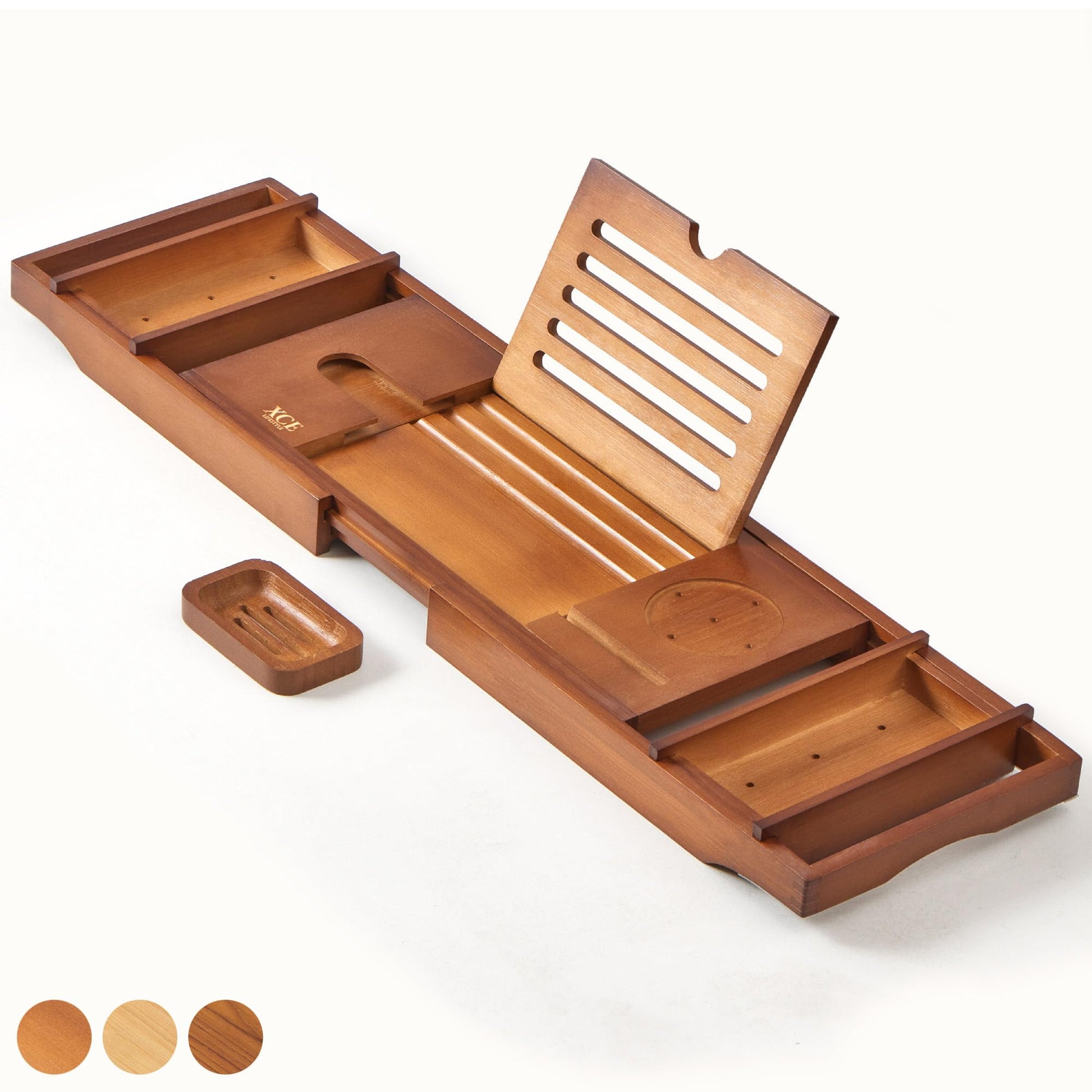 XcE Bathtub Caddy Tray Expandable to 105cm with Bamboo Book Stand and Soap Tray, Brown