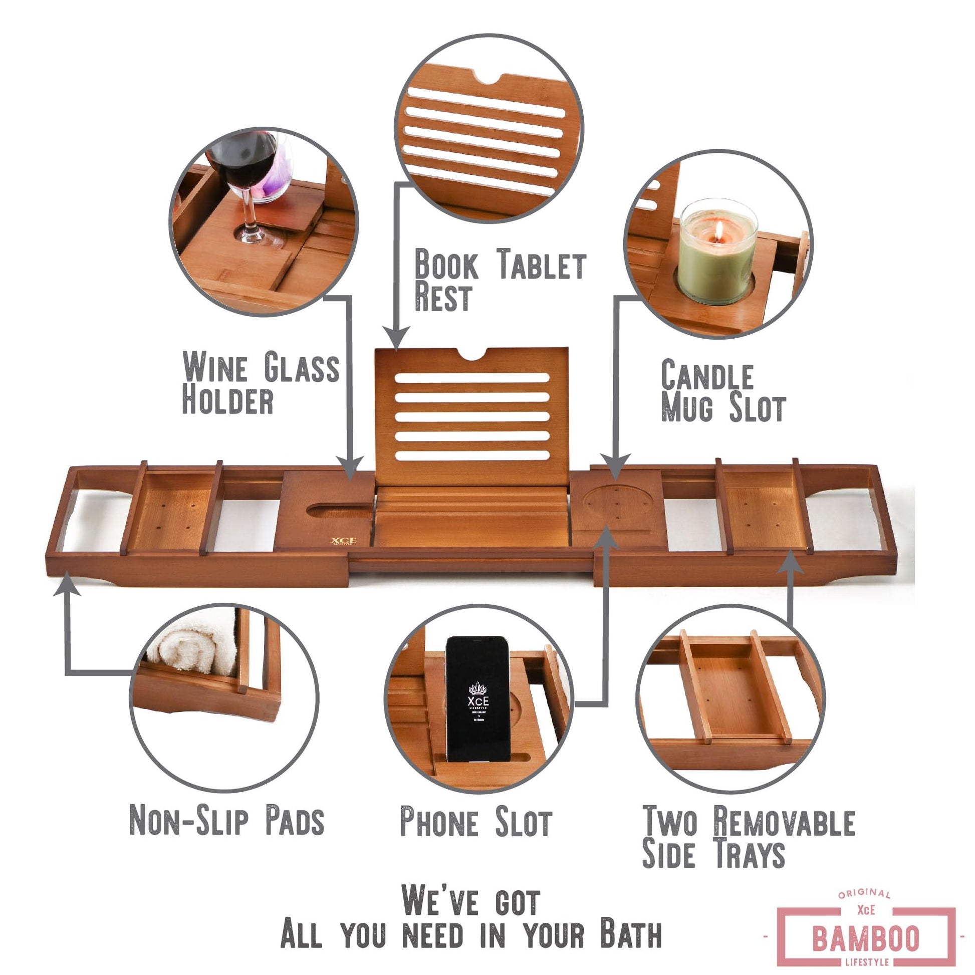- Crafted from premium quality bamboo, this unique bathtub caddy is built to last, ensuring an elevated bathing experience every time.