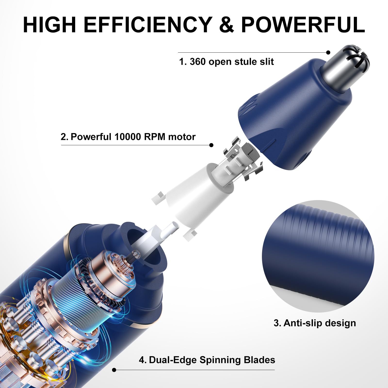- 【Powerful & Painless Nose Trimmer Women】-Our nose hair trimmer features an inner 360° rotating design that smoothly and painlessly removes hair without pulling. The powerful 10000 RPM motor ensures precision trimming without any unpleasant sensations.