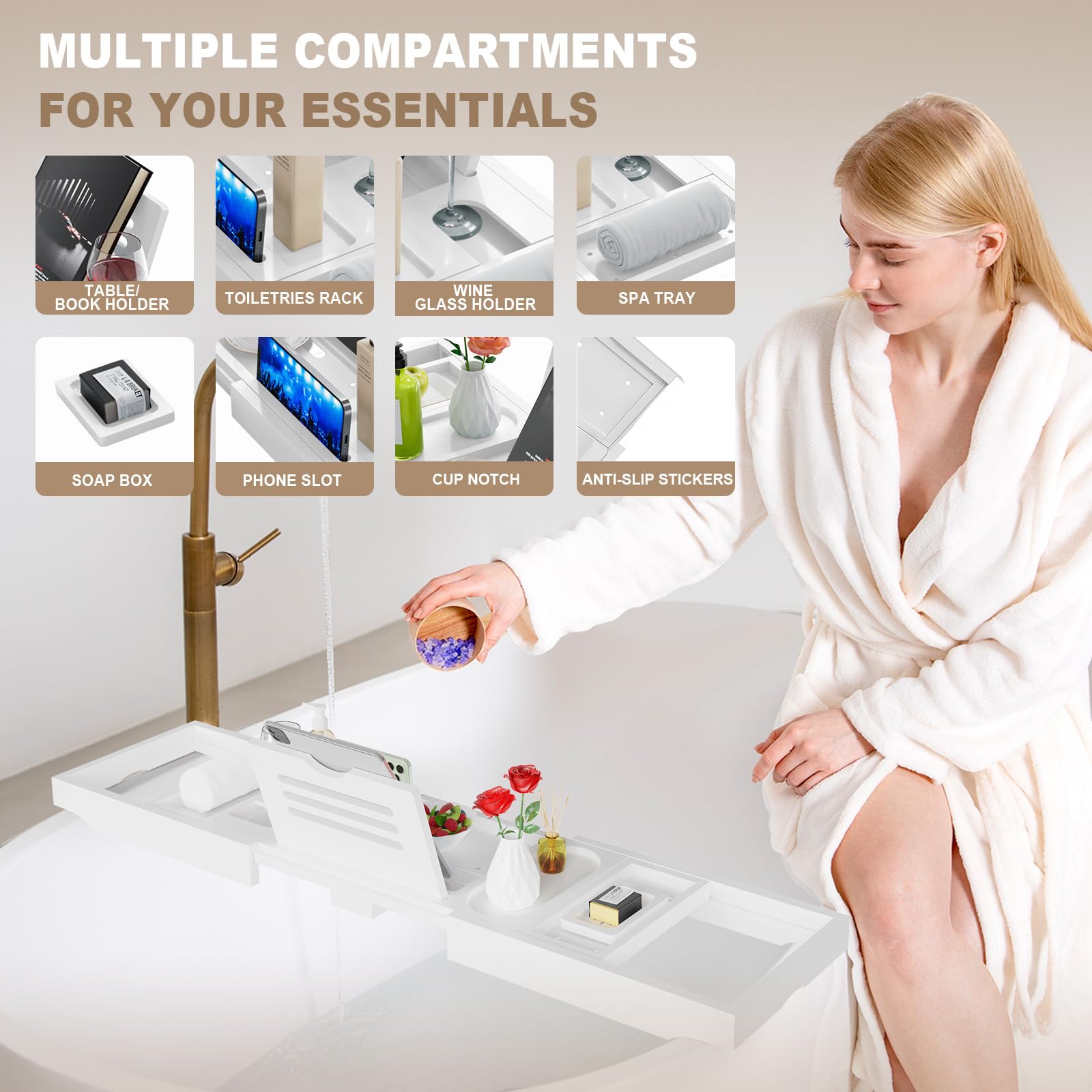 Details: Luxurious bath tray for tub - transform your bathing experience! Elevate your relaxation with our exquisite bathtub tray, crafted from 100% wood, known for its unique fragrance and one-of-a-kind grain patterns. This housewarming gifts new home is not just a practical addition to your bathroom but a luxurious statement piece. Bridal shower gifts :Made from 100% wood, this bath tub tray offers durability, water resistance, and a natural, pleasant aroma. New job gifts for women :The house warming gifts new home includes a foldable stand for books and iPads, a wine glass holder, a sliding tray, and compartments for towels and soap. Bath spa gifts for women also features drainage holes and non-slip strips to keep the tray in place, ensuring a safe and comfortable bathing experience. Bathtub caddy tray for tub designed to fit most bathtubs, this bathtub trays for tub can be extended from 28.5 inches to 41 inches, making wedding gifts for couple perfect for both small and large tubs. When not in use, wedding gifts for couple folds up for easy storage, saving space and maintaining a tidy bathroom. Bath caddy tray for bathtub ideal for creating a spa-like atmosphere, this bath table tray can also serve as a thoughtful gift for various occasions, including housewarming, weddings, anniversaries, bridal showers, and birthdays. Tub tray for bathtub: Bathtub tray caddy with its elegant design and functional features, this bath tub caddy transforms ordinary baths into luxurious spa experiences. Tub table for bath packaged beautifully, it makes an excellent gift for anyone who loves a touch of luxury. Whether it’s for a wooden bathtub tray or a friend's birthday, this bath trays for women is sure to delight. Home decor gifts for women the high-quality wood is easy to clean and maintain, ensuring long-lasting use and beauty. Upgrade your bathing routine with our best wedding gifts for couples and enjoy a serene, spa-like experience