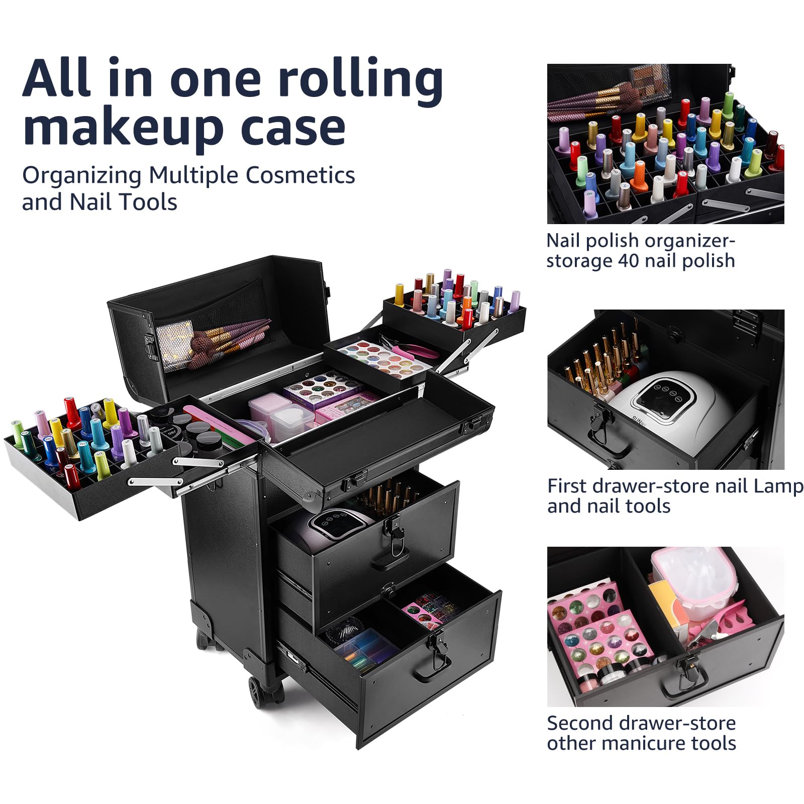 - Muti-functional & Large Capacity Cosmetology Case on Wheels: The first layer of cosmetology Case features a nail polish bottle slot with dividers that can hold and protect 45 nail polish in an upright position or remove the dividers to hold large beauty supplies. The top lid also has a makeup pouch to put makeup brushes and other cosmetic supplies and 2 large sliding drawer has great storage for flat/curling iron, sprays, palettes, and other items in relatively big sizes.