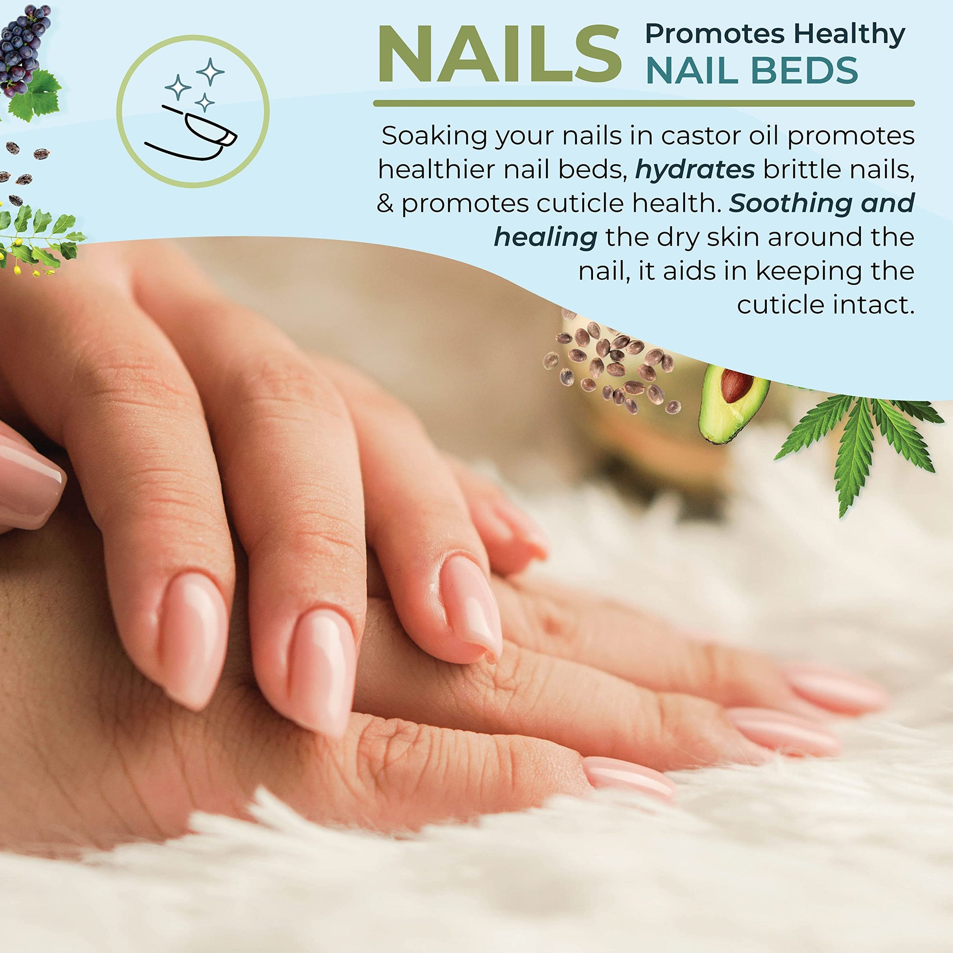 - NAIL OIL: Soaking your nails in castor oil promotes healthier nail beds, hydrates brittle nails, and promotes cuticle health. Soothing and healing to dry skin around the nail, it aids in keeping the cuticle intact and sealed properly around the nail bed.