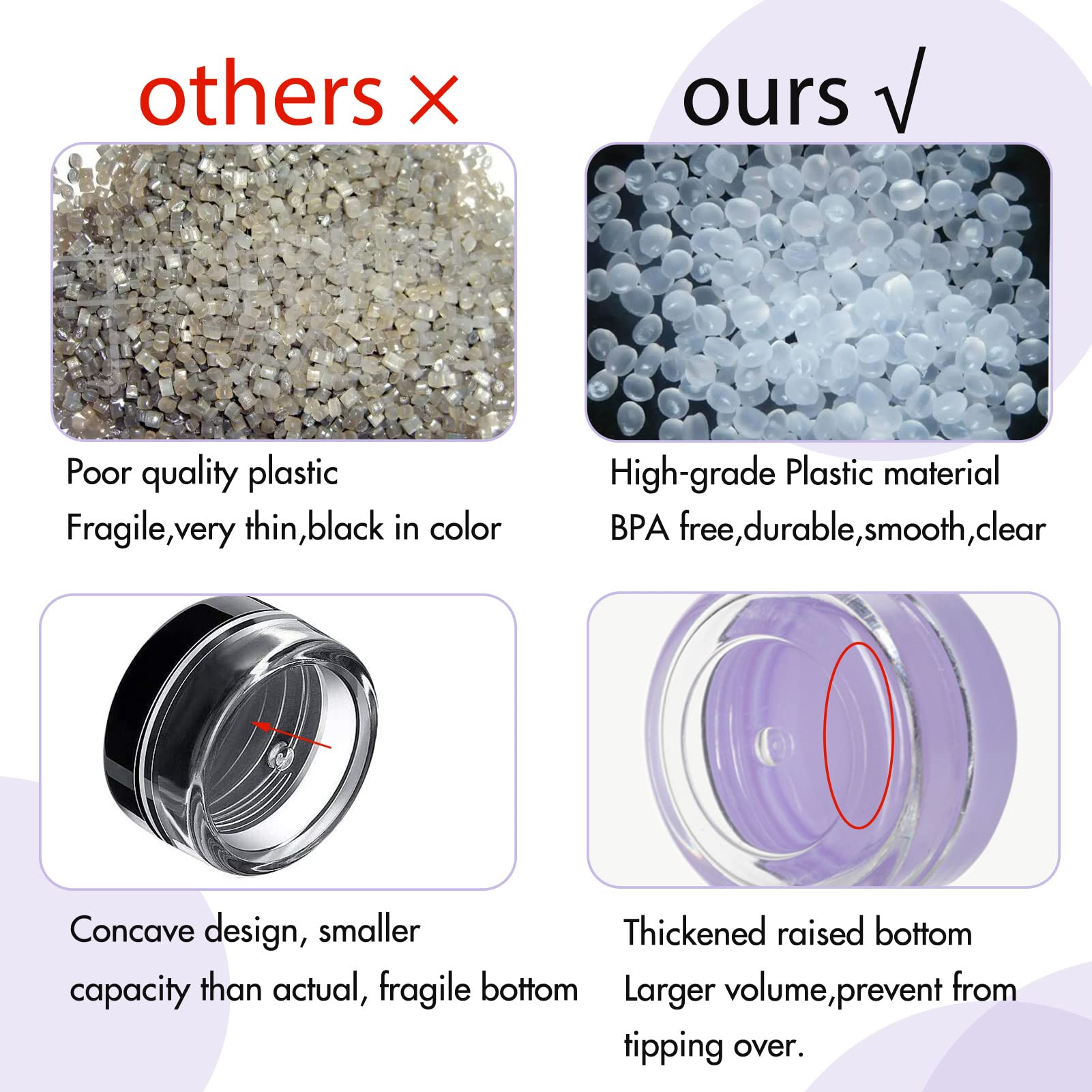 - [PREMIUM QUALITY DESIGN] These tiny cosmetic containers are made of high-grade polypropylene, generally do not react chemically with makeup, are resistant to breaking and warping from heat, have a tight seal, and prevent leaking. And with PS (polystyrene ) bottle body & PP (polypropylene) lid, these sample jars are thick and smooth.